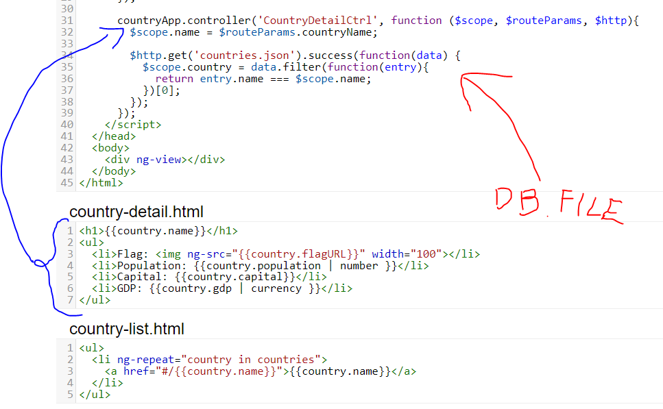 This example surfacing data on the country details page. By using filtering gets first data in array and set this element to the scope property country on the model. From now country detail page have access to the value from DB file and using define detail view from country-detail.html.