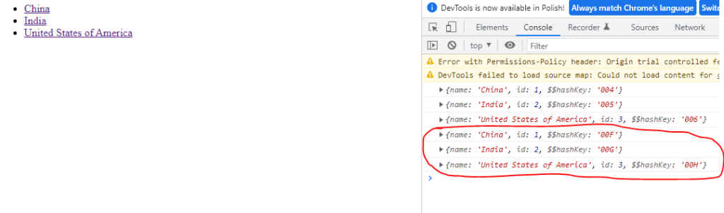 This example adding a controller to our custom directive. Directives just like routes can have their own controllers. In code have been define controller that gets the scope and it injects the country’s service that had been created before and create outputs.