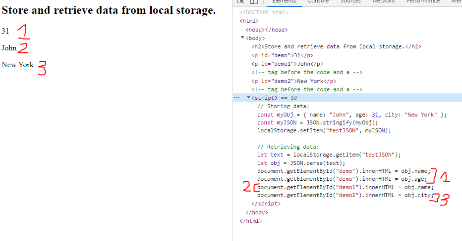 This code demonstrates how to store and retrieve data using local storage in a web browser.