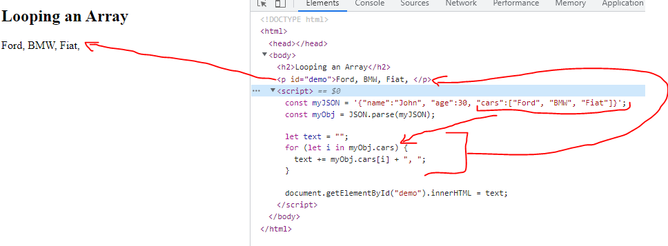 Next, an empty string variable text is declared. A for loop is used to iterate through each element in the cars array property of myObj. The loop uses the for…in statement to iterate over each index of the cars array. The loop body concatenates each element of the cars array followed by a comma and a space to the text variable.